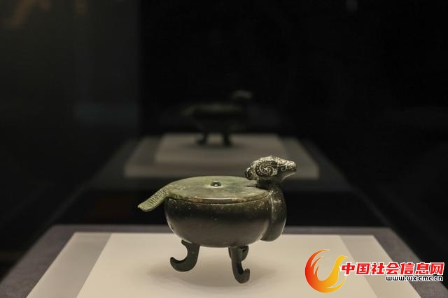进入展厅的首件文物,是春秋时期的附盖三足羊形铜尊。这件三只脚的“小可爱”,通体为铝黑色,器身通高仅11厘米、通长14厘米、口径9.2厘米。别看它器型小巧,却是楚文化博物馆的镇馆之宝之一。它于1977年出土于寿县正阳关镇肖严湖,在同时期出土文物中独一无二。整件器物似绵羊形,盖扁平,正中有桥形半圆钮,一端呈扇形下斜作绵羊尾状,尾上饰有勾连云雷纹,相对的一侧有半圆弧形缺口,卡入羊颈。“从体量上看,它应该是摆放小零食的‘萌趣食盒’。”闵行博物馆宣教部主任徐迪介绍。