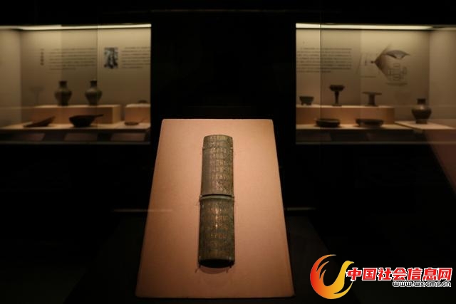 另一件焦点展品——鄂君启金节,为楚怀王颁发给儿子“启”运输商品的免税通行证,是研究楚国的用节方法、关税制度、水陆交通、经济贸易、历史地理以及楚王与封君关系等的珍贵史料。金节分两种:稍长的舟节是船只水运的凭证,稍短的车节用于陆地车辆运输。鄂君启金节,目前共发现了五件,其中三件为车节、两件为舟节。此次来到闵行博物馆的,就是其中一件车节。《周礼》记载,最早的符节是把竹子剖开制成的,鄂君启金节形状恰似剖开的竹片。它通体由青铜铸造,并配以错金铭文,在岁月的侵蚀下,更添竹子的“青葱”色彩。为便于观众观赏,金节被放在坡台上展示,布展人员特意为其详量身定制了六个支撑柱。