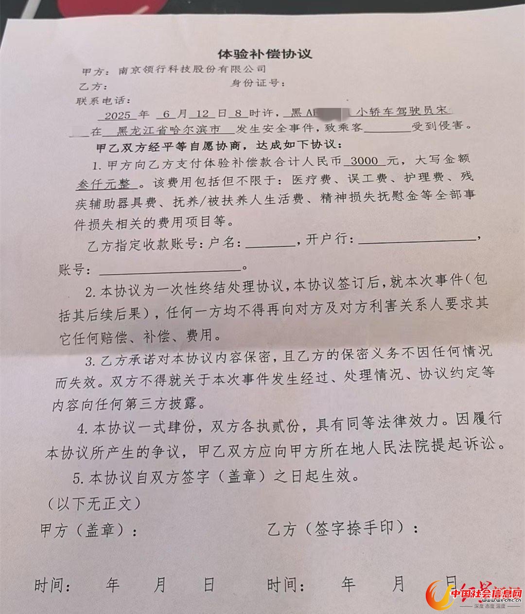 赵女士称,事发后她向T3出行平台投诉,平台将她两次打车的费用120元左右全部退给她,并表示愿意赔偿500元,被赵女士拒绝。“随后对方又称赔偿3000元,但是需要签署协议,内容是收到3000元后不得向任何第三方透露这个消息,也不得向加害者(网约车司机)索要任何经济赔偿。”赵女士认为这份协议侵犯了她的合法权益,没有签署。