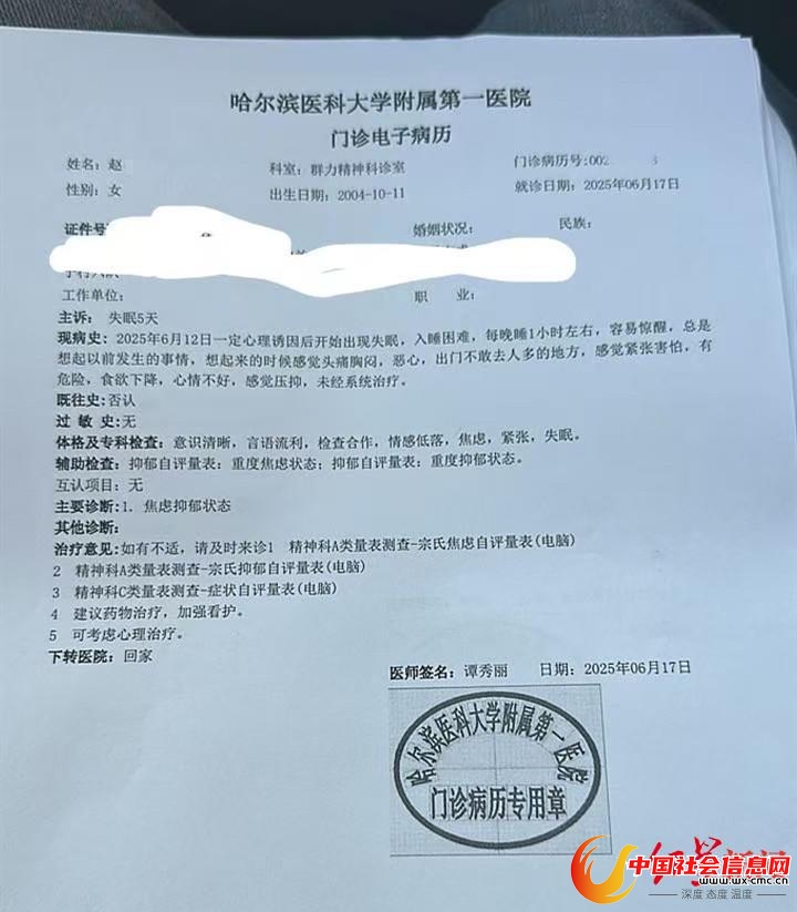 “对我影响太大了,我连续5天无法入睡。”6月17日,赵女士前往哈尔滨医科大学附属第一医院群力精神科诊室就诊,“体格及专科检查”显示其意识清晰,言语流利,检查合作,情感低落,焦虑,紧张,失眠。“辅助检查抑郁自评量表”显示其重度焦虑状态;重度抑郁状态。主要诊断结论为:焦虑抑郁状态。医生建议:药物治疗,加强看护,可考虑心理治疗。