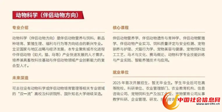 动物科技学院负责招生工作的副院长刘国世介绍,动物科学(伴侣动物)是紧密围绕产业高质量发展需求,覆盖伴侣动物品种培育、营养代谢、饲料加工、繁殖生理、福利与行为等课程的新兴专业。