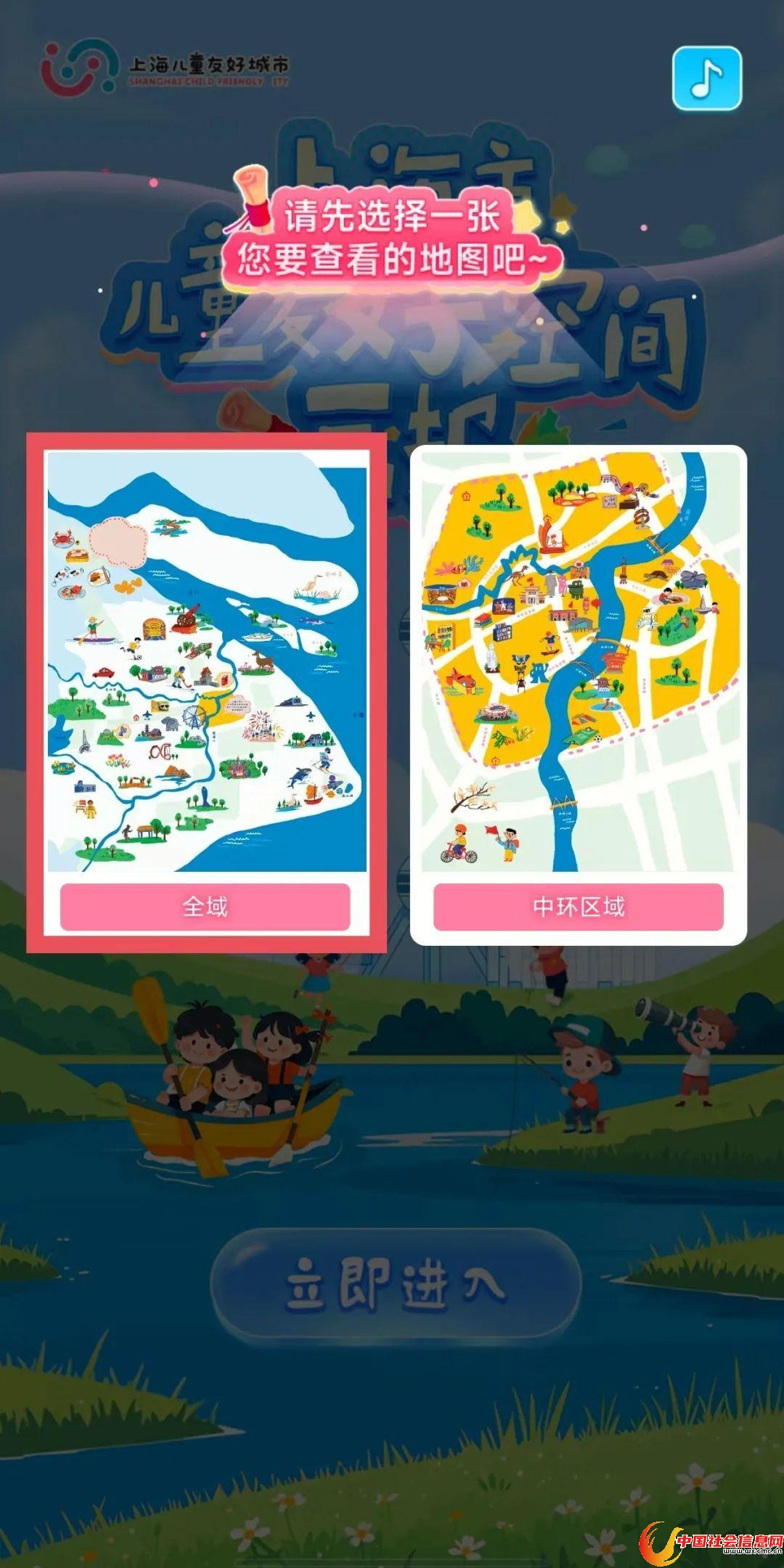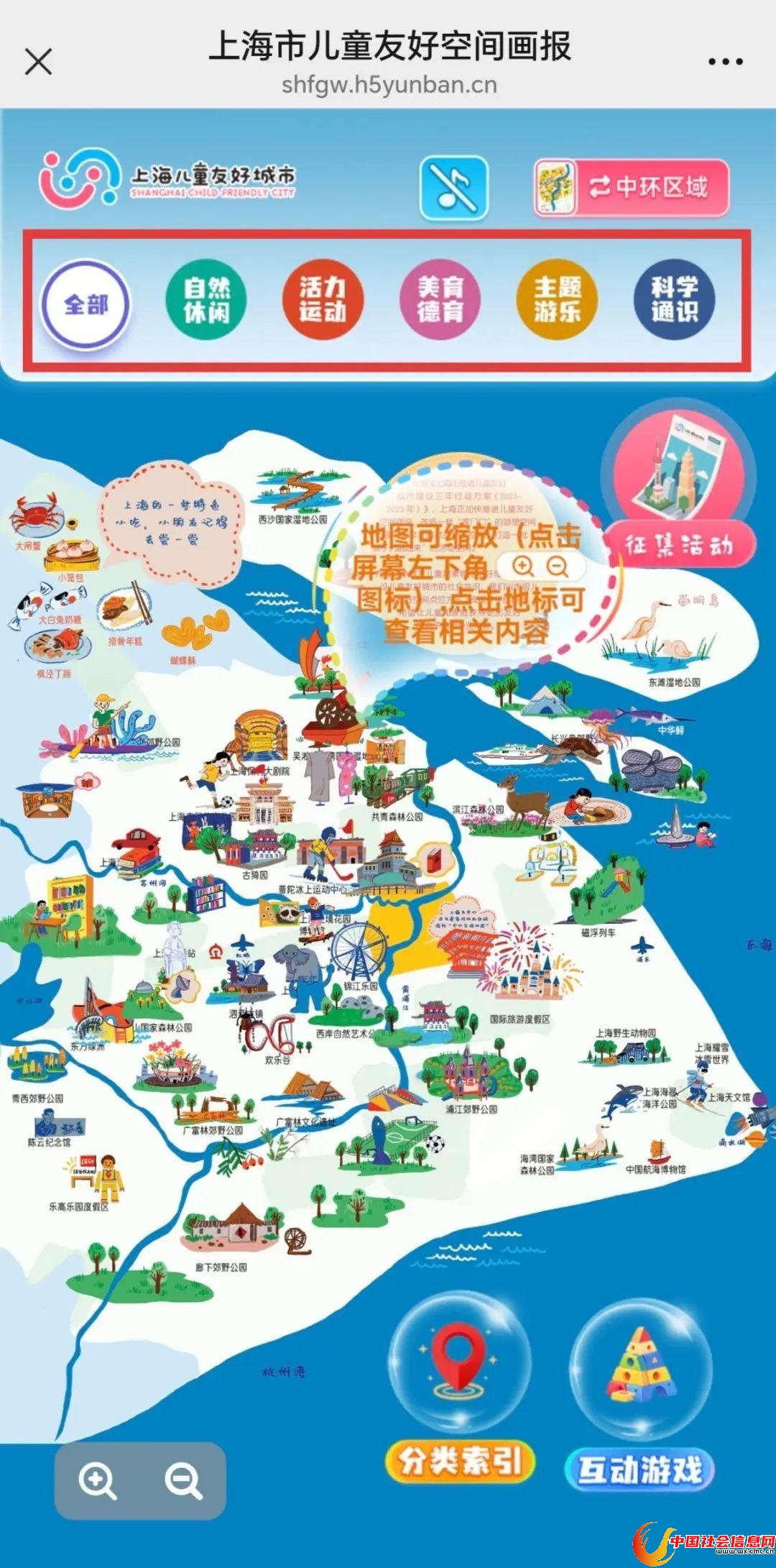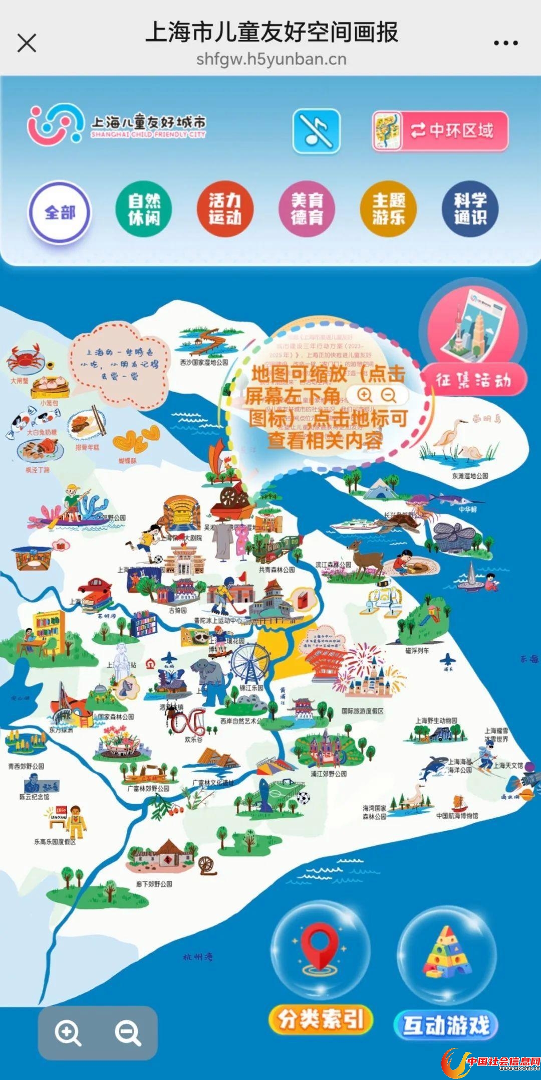 《上海市儿童友好空间画报》分为“全域”“中环区域”两张,点击地图可查看详情。