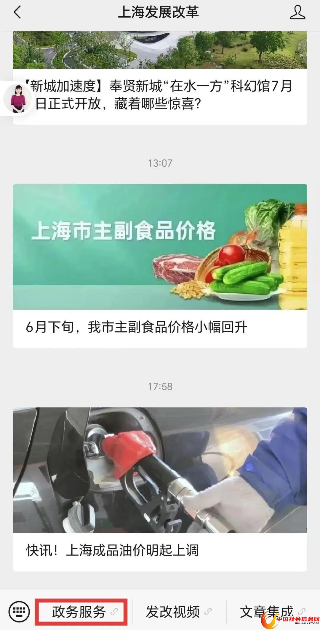 2、或关注“上海发展改革”微信公众号,点击微信按钮“政务服务”查看相关内容