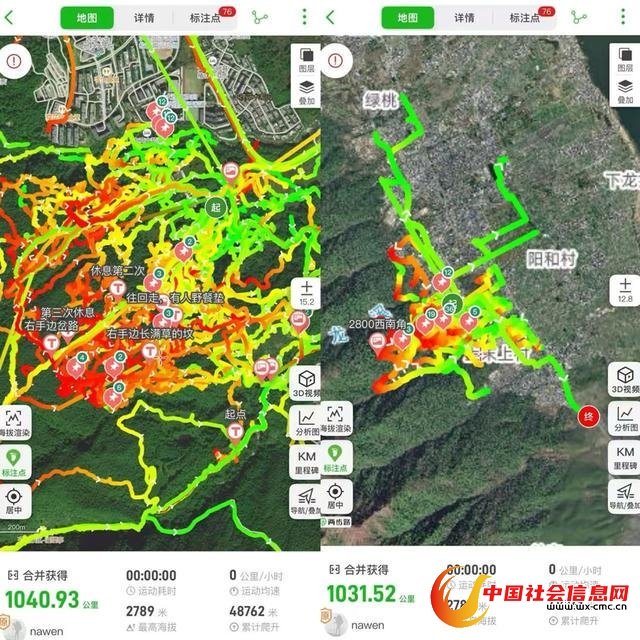 左图:按海拔高低渲染的山中搜寻轨迹图。右图:搜救的全部路线,覆盖至山下街道。