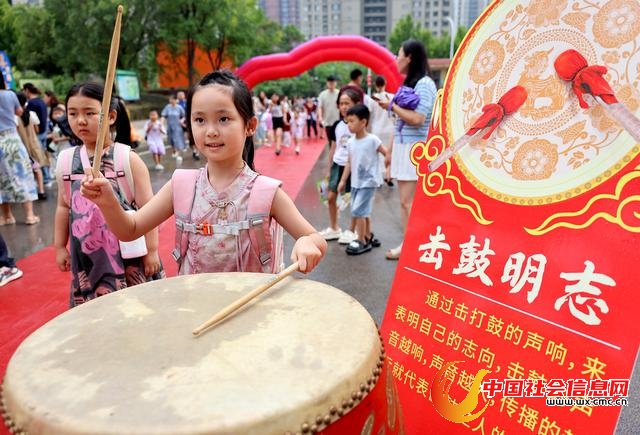 8月30日,在山东省枣庄市市中区东湖小学,一名一年级新生在“击鼓明志”。新华社发(孙中喆 摄)