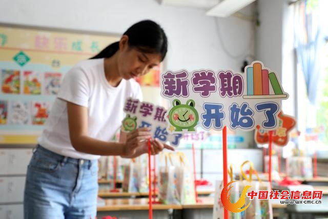 8月30日,在山东省滨州市博兴县第一小学,老师在布置教室迎接开学。新华社发(陈彬 摄)