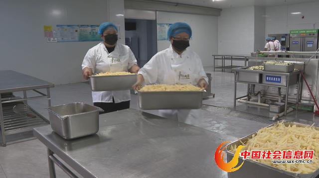 在河南省鹤壁市外国语中学后厨,学校组建的专业餐饮团队正在配餐。(霍丹 摄)