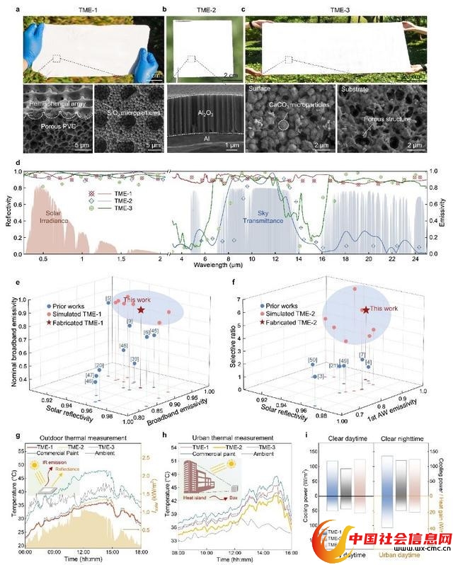 为验证AI模型的实际效能,课题组经过筛选,在实验室制备出这个模型设计的4种热辐射超材料。在多种户外场景实测中,这些超材料均展现出优异的自降温效果。比如在晴朗的正午,宽波段超材料的下表面温度比环境温度降低5.9摄氏度;在多云条件下,单波段选择性超材料的降温性能更显著,下表面温度比环境温度降低4.6摄氏度;在城市建筑群模拟环境中,单波段选择性超材料的下表面温度分别比宽带超材料、商用白漆涂覆表面低2.5摄氏度和5.3摄氏度。将双波段选择性超材料涂覆在模型屋顶,其表面温度比商用白漆涂覆表面低5.6摄氏度,比灰色涂料涂覆表面低21摄氏度,炙热的屋顶会瞬间凉爽下来。