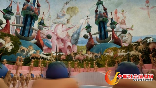 本次首度“离”馆的五大镇馆之宝,邀请观众畅游在这场跨越时空的艺术之旅中。观众的体验从勃鲁盖尔与鲁本斯笔下熠熠生辉的《视觉的寓言》(1617)启程,紧接着穿梭于委拉斯开兹1656年创作的《宫娥》(1656)错综的镜像迷宫;当委罗内塞描绘的《维纳斯与阿多尼斯》(约1580)神话悲剧在眼前坍缩为巴洛克时代的爱情寓言,戈雅《女巫的安息日》(1819-1823)的暗黑笔触已悄然将人引向聋人庄园的禁忌壁画;最终,观众在博斯《人间乐园》三联画创造的奇谲图景中结束。《人间乐园》堪称超现实主义杰作,画中元素宛如天外来客,人形与动物结合的产物,有机材质构成的建筑,违反常理的肢体姿态,布满晦涩的符号,甚至是对五百年前的规则的挑衅,因此激发了长久的讨论。博斯的这幅《人间乐园》作为VR体验的结尾,也是一种艺术乐园的隐喻。
