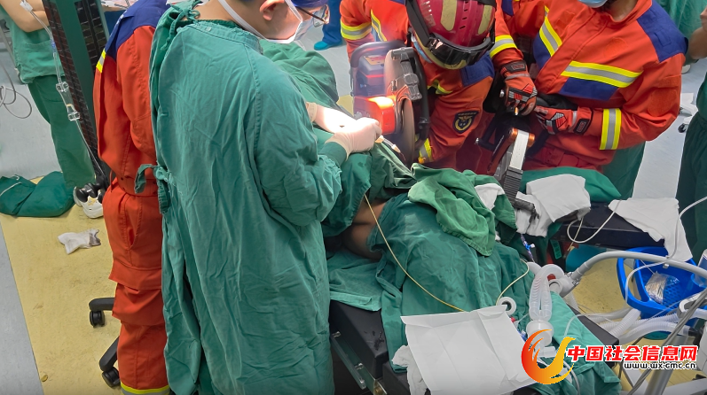 在医院医护人员的带领下,消防救援人员携带好所需要的工具后走进手术室。当时,伤者已被送到手术室,救援人员协助医护人员将伤者转移到手术台上。指挥员经与主治医生商量迅速达成“作战方案”:先切除伤者背后左肾位置多出来的钢管,尽量避免晃动伤及内脏。