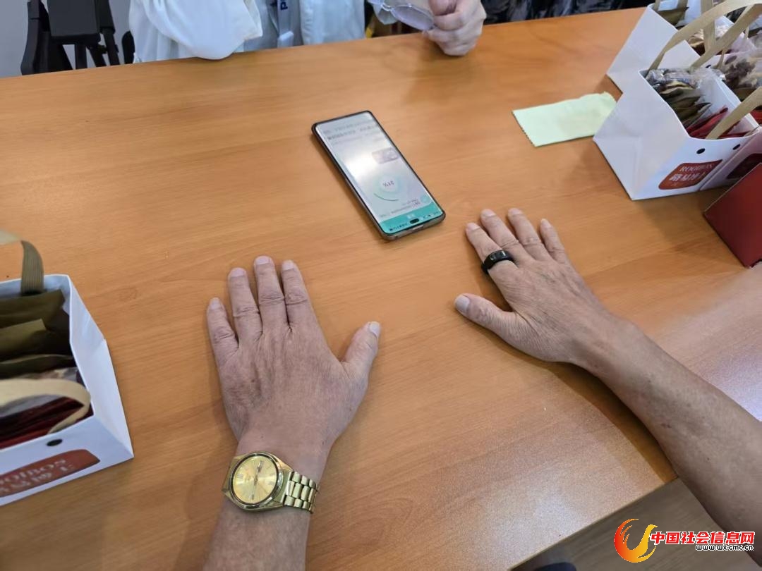 讲座结束,中预医学的工作人员早已准备好智能检测设备。居民们有序排队体验,手指轻轻一套智能环,几分钟后,一份清晰易懂的健康报告便呈现在眼前:体质类型、潜在风险提示、个性化调理建议一目了然。