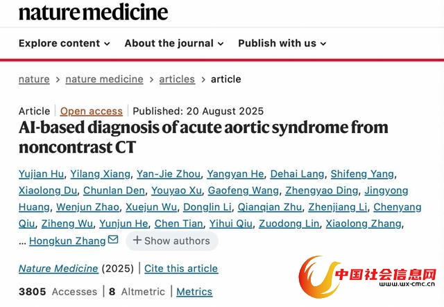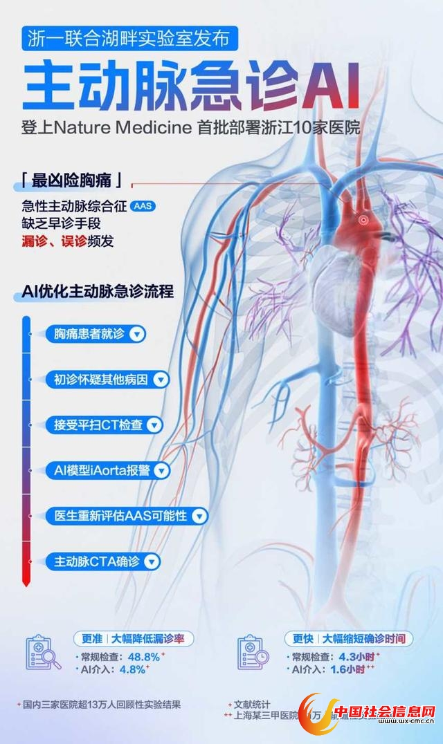 急性主动脉综合征是一种危急的心血管疾病,起病隐匿、进展迅速,但难以第一时间确诊。8月27日,浙江大学医学院附属第一医院、湖畔实验室(阿里巴巴达摩院)发布用于胸痛急诊场景的AI模型iAorta,可用常规平扫CT在几秒内识别急性主动脉综合征,将确诊时间缩短至2小时内,已从1万多名胸痛患者中精准发现21例,帮助他们得到及时救治。相关论文20日发表在国际顶级期刊《自然·医学》(Nature Medicine),该AI模型已在浙江首批10家医院部署,即将全国推广。