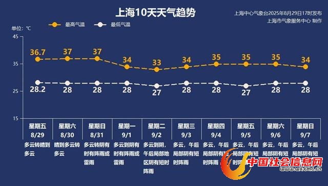 降温什么时候才轮到上海?预报显示,周日夜间至下周一,上海有一次降水天气过程,有阵雨或雷雨出现,最高温短暂降至高温线以下。下周一恰逢全市中小学开学日,上学和放学时段需要留意交通安全。