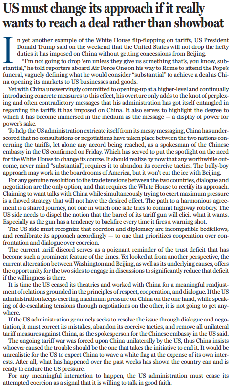 解决中美经贸分歧,对话协商是唯一选择,而这首先需要美国纠正以往错误做法,要对话不要对抗、要协商不要胁迫。一边说要同中方达成协议,一边不断搞极限施压,这不是同中方打交道的正确方式,也是行不通的。霸凌手段可能在美国国内行得通,但中国人不吃这一套。