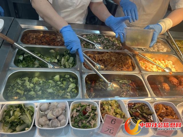 走进助餐点,40多个就餐位几乎座无虚席。墙上,营业执照、食品经营许可证和工作人员信息张贴得整整齐齐,当天菜单也一目了然。餐台上,十几种荤素菜品琳琅满目,价位从3元到15元分为6个档位,无论是清爽的时蔬,还是新鲜现做的酱爆猪肝、扎实饱满的狮子头等“硬菜”,都冒着热气,香味扑鼻。