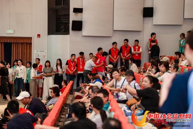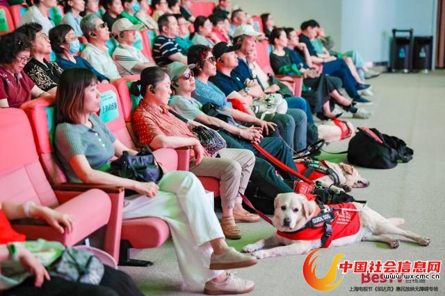 有趣的是,中华艺术宫艺术剧场的“零排”观众有点特殊,一群可爱的导盲犬乖巧地趴在主人身边,共同欣赏放映纪录片。现场,除了观众,剧场通道上也着不少志愿者。中场休息时,会有志愿者护送视障观众往返卫生间。来自文绮汇点中学的中学生志愿者也一起参与了无障碍影片的制作和现场的志愿服务。