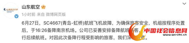 6月27日,SC4667(青岛-虹桥)航班飞机故障,为确保旅客安全,机组按程序处置后,于16:26备降南京机场。公司已妥善安排备降航班旅客,并已安排其他飞机执行后续航班。对因此次备降行程受影响的旅客,我们深表歉意。