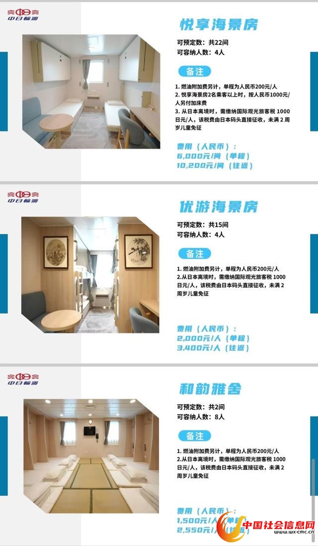 需要注意的是,每位旅客还需要支付单程200元的燃油附加费。从日本返回时,2岁以上的旅客每人需缴纳1000日元的国际观光旅客税。如果旅客购买往返船票,不同房型会有不同程度的价格优惠。