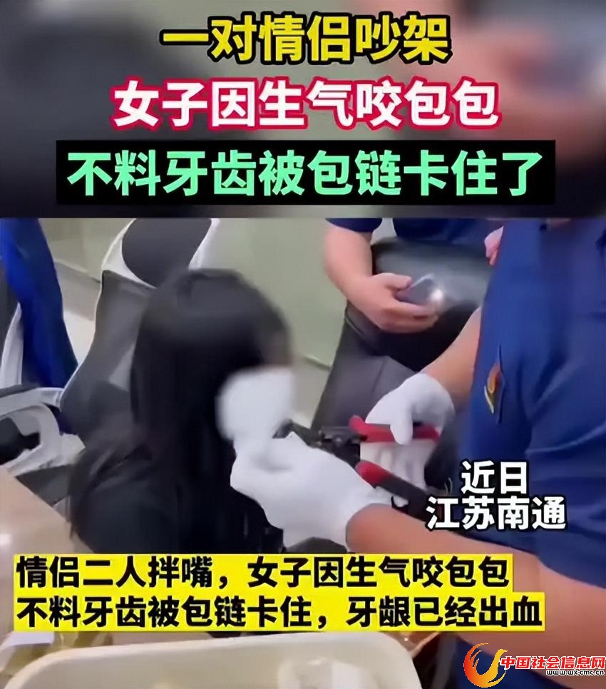 6月6日,据南昌晚报视频报道,近日,在江苏南通,情侣二人拌嘴,女子因生气咬包包,牙齿被包链卡住,牙龈已经出血。