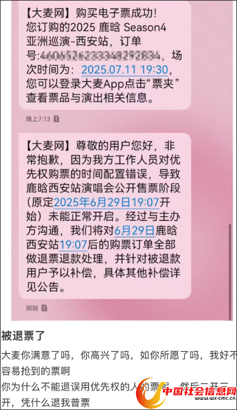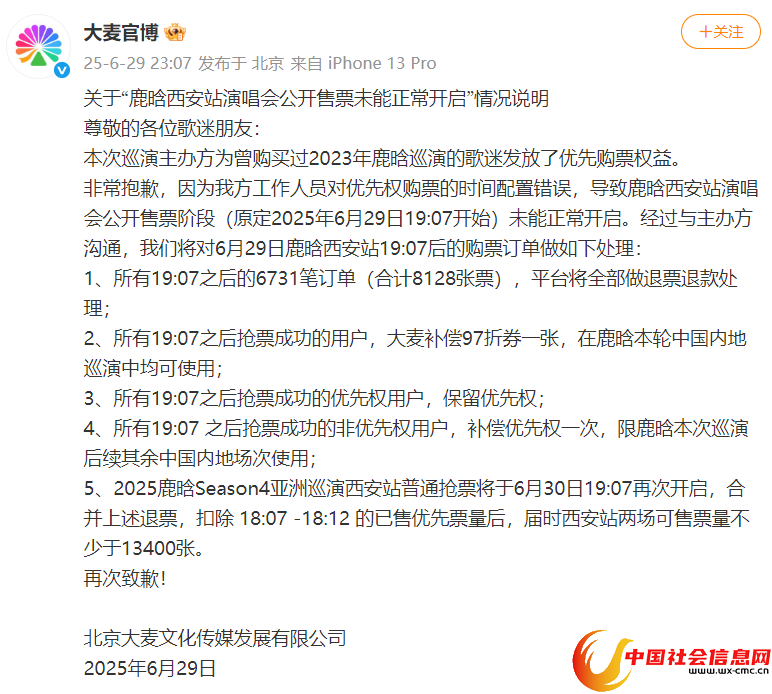“非常抱歉,因为我方工作人员对优先权购票的时间配置错误,导致鹿晗西安站演唱会公开售票阶段(原定2025年6月29日19:07开始)未能正常开启。经过与主办方沟通,我们将对6月29日鹿晗西安站19:07后的购票订单做如下处理: