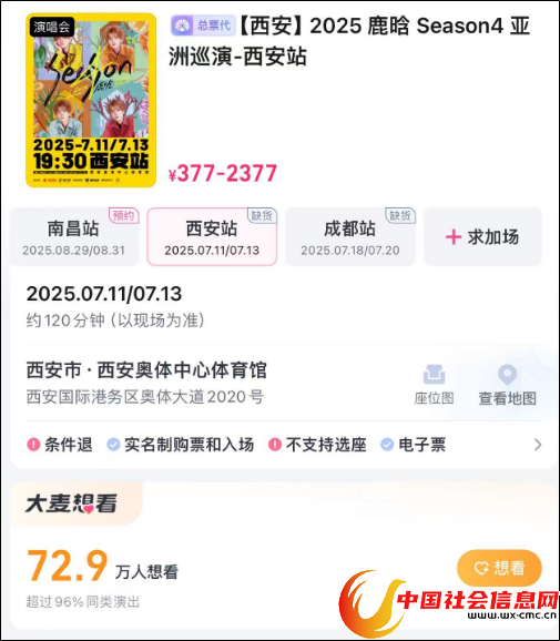 今(6月30日)早10时,记者搜索大麦App发现,鹿晗西安站演出显示“72.9万人想看”,该场演唱会最低票价377元,最高票价2377元。7月11日场和7月13日场均显示无票。