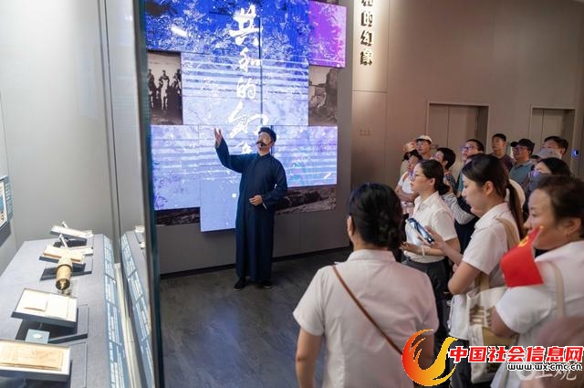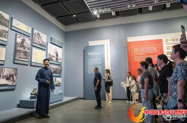 由“李大钊”扮相讲解员带领现场观众沉浸式参观《伟大的开端》展览,追溯建党初心。