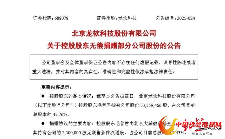 以7月2日龙软科技收盘价(30.90元/股)计算,此次捐赠股票市值为7725万元。捐赠后,毛善君所持龙软科技股权比例降至42.34%,不影响其控股股东地位。