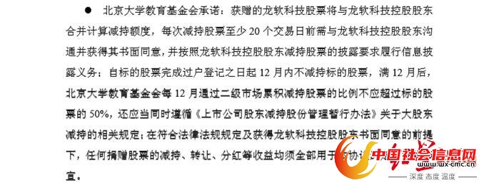 对于本次捐赠,北京大学教育基金会承诺:在符合法律法规规定及获得龙软科技控股股东书面同意的前提下,任何捐赠股票的减持、转让、分红等收益均须全部用于本协议约定的捐赠事宜。
