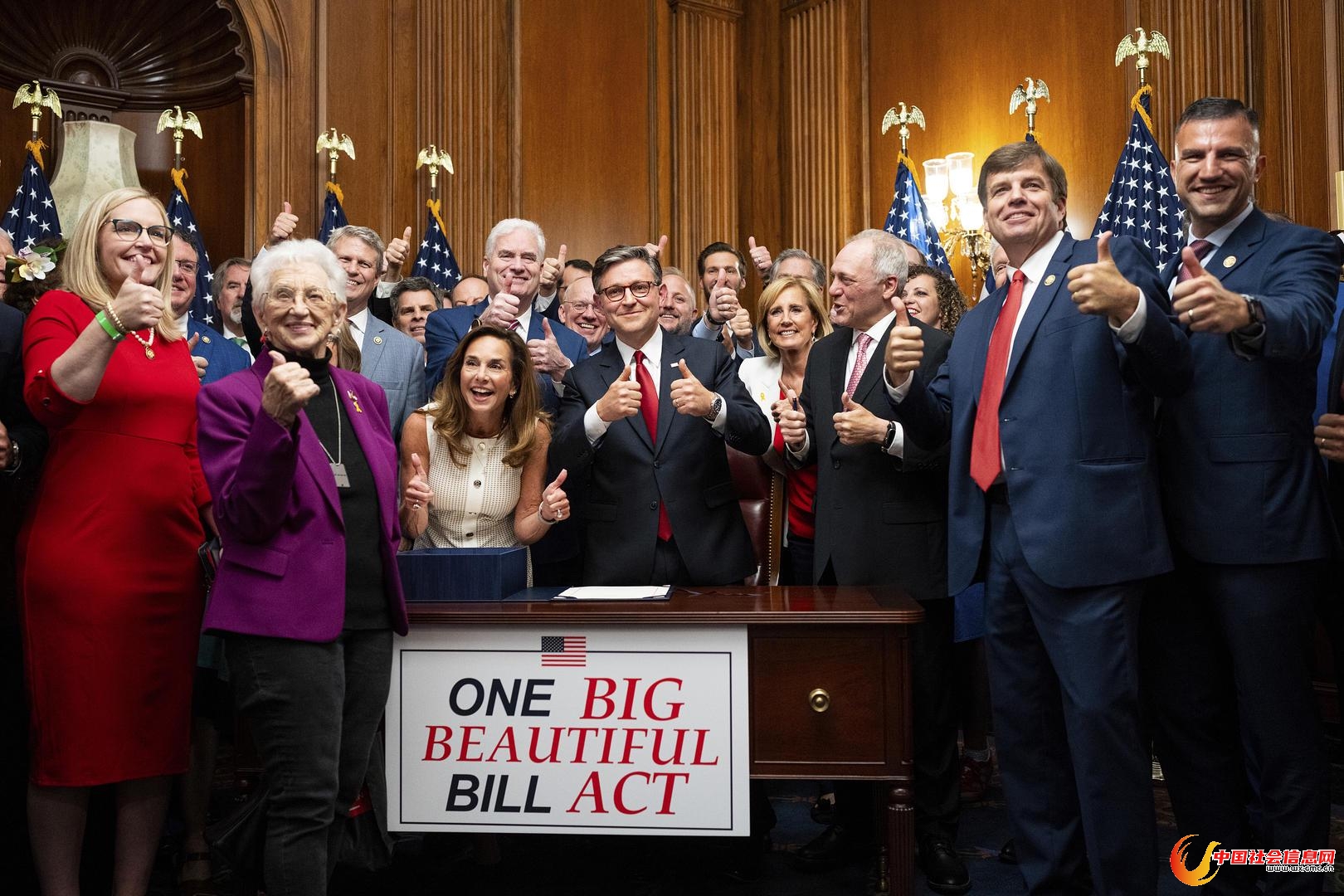 当地时间7月3日,“大而美”法案通过后,美国国会众议院议长约翰逊和众议院共和党人在法案登记仪式上竖起大拇指(图据视觉中国)