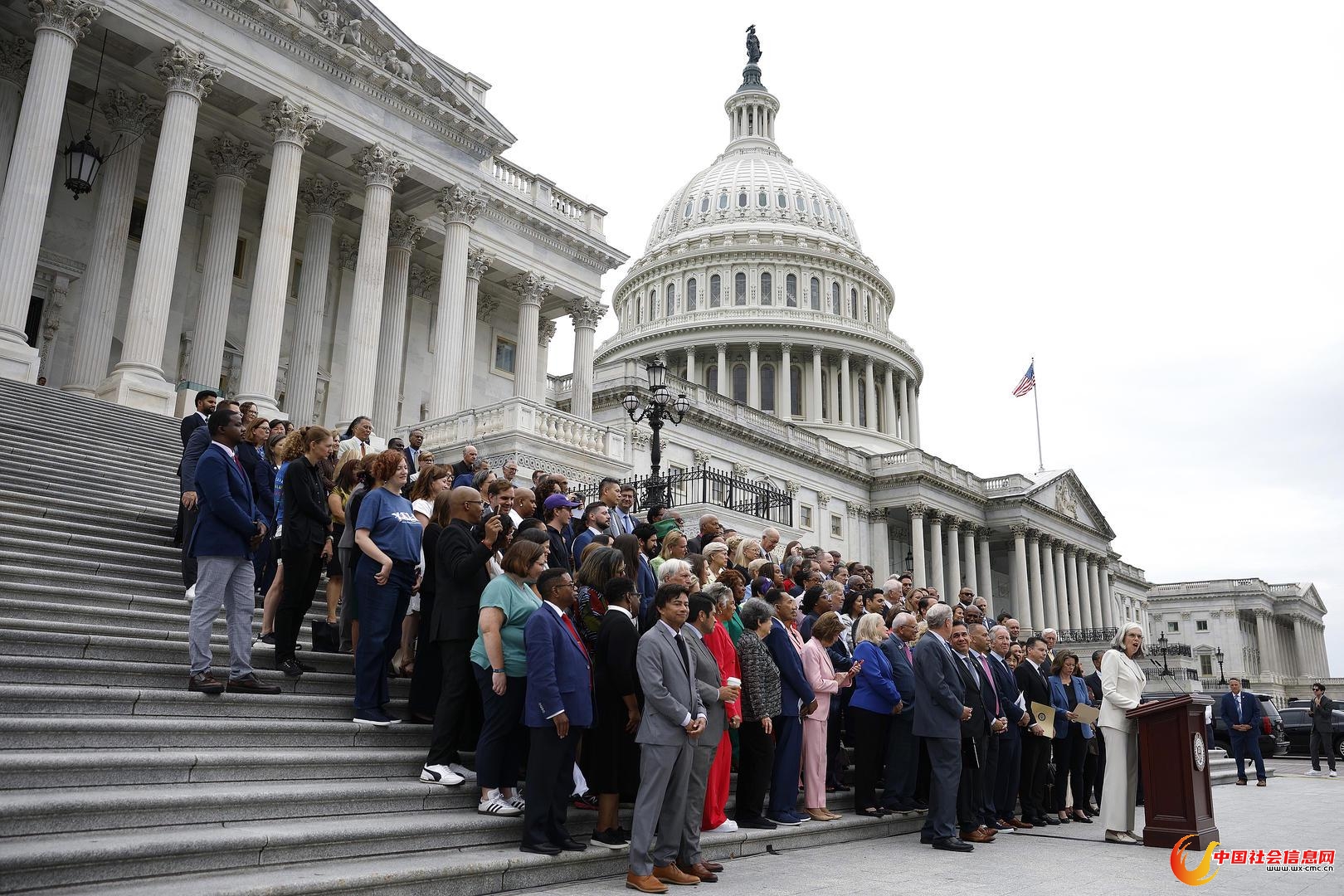 当地时间7月2日,美国国会大厦外,美众议院少数党党鞭、民主党人凯瑟琳·克拉克(中)与民主党同僚在记者会上发言,反对“大而美”法案(图据视觉中国)