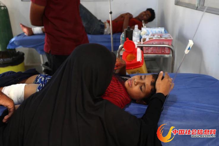 ▲一名巴勒斯坦妇女在医院安慰受伤的孩子