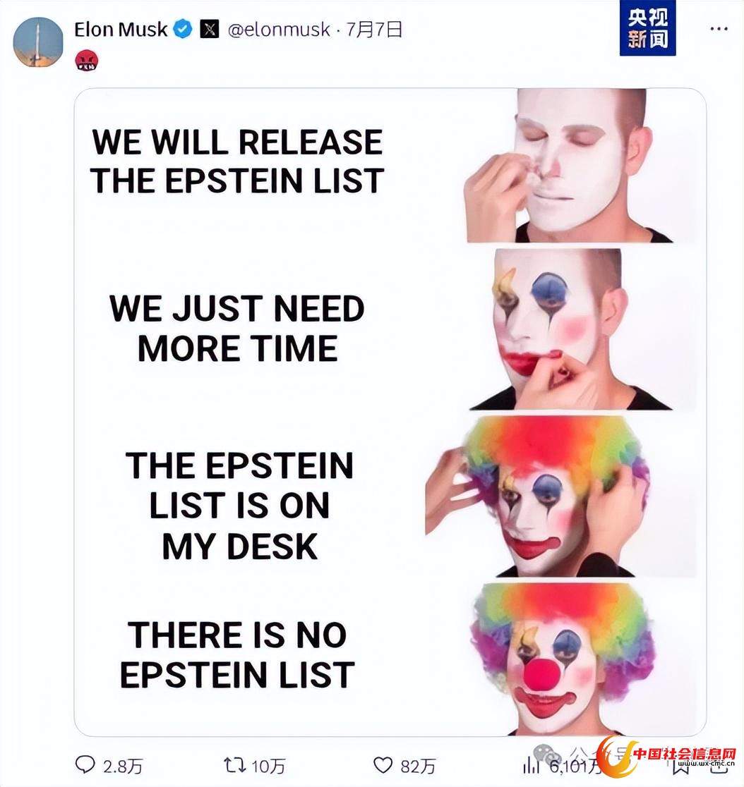 美国司法部宣布没下文后,他马上发布一张小丑形象的梗图,展示了美国政府在这个问题上不断变化的立场:我们将公布爱泼斯坦案名单→我们需要更多时间→爱泼斯坦案名单就在我桌子上→爱泼斯坦无“客户名单”。