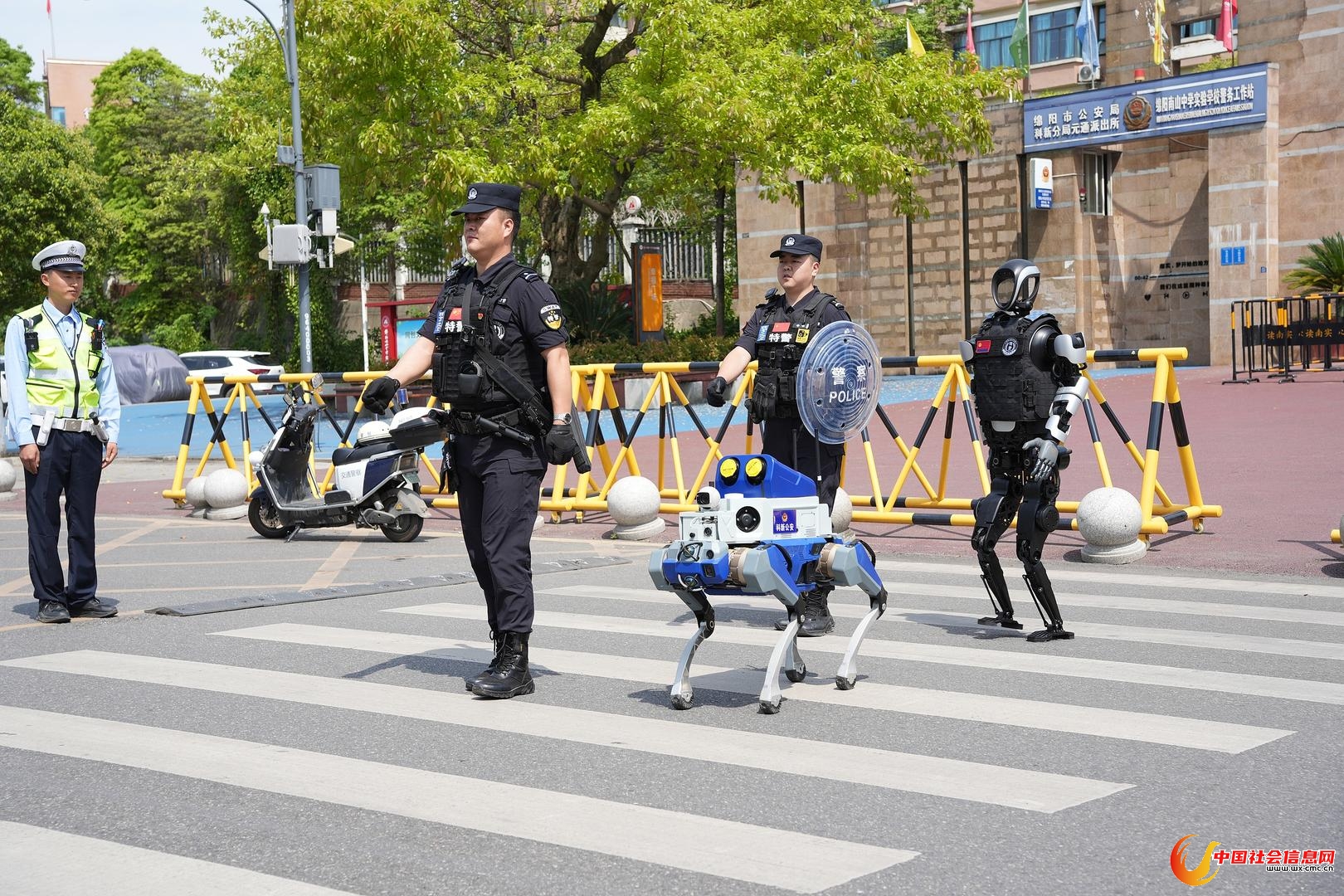 ▲2025年4月27日,四川绵阳街头,智能机器狗和机器人跟随民警过斑马线。图据视觉中国