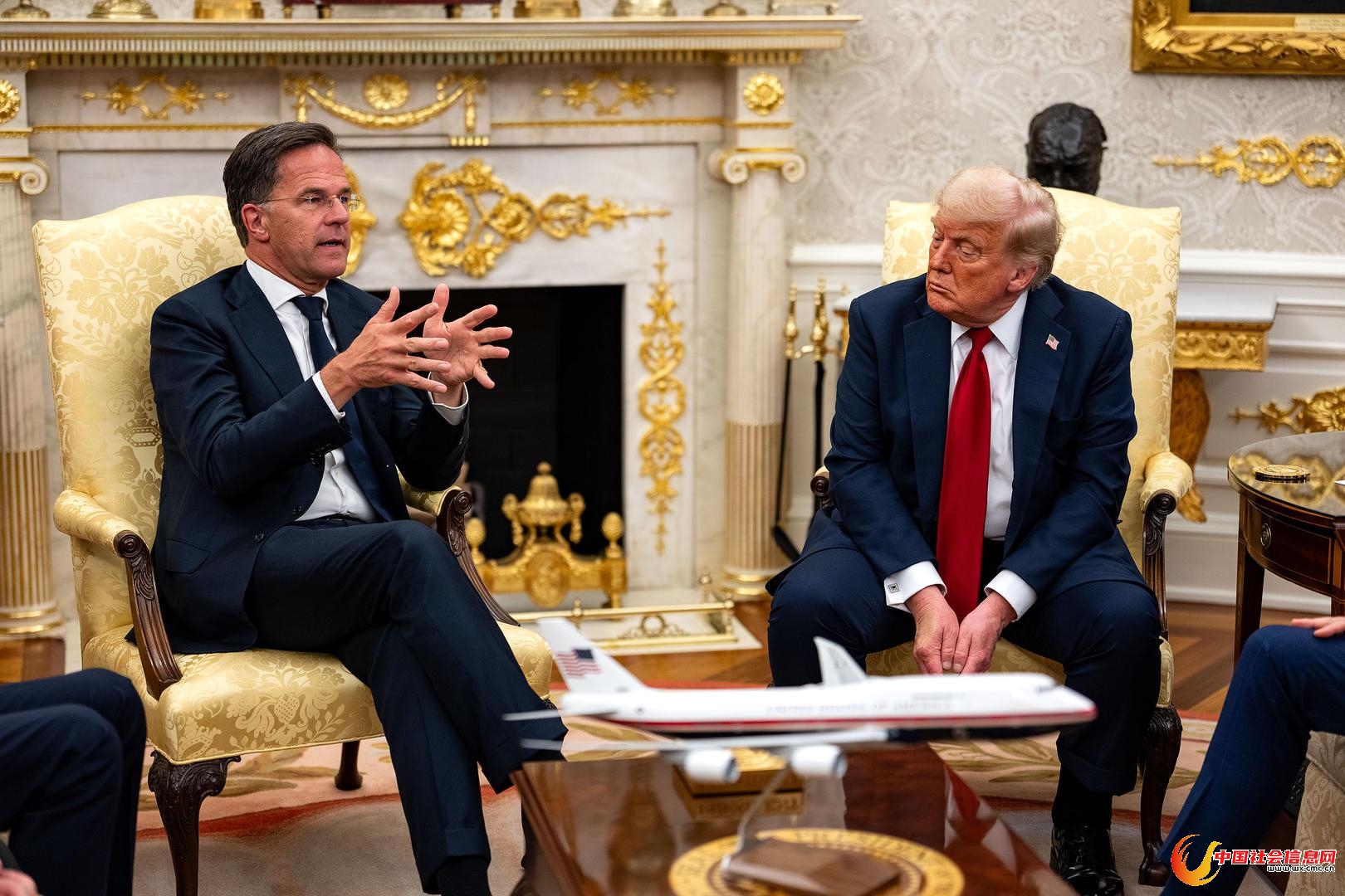 当地时间7月14日,特朗普在白宫椭圆形办公室会见北约秘书长吕特(图据视觉中国)