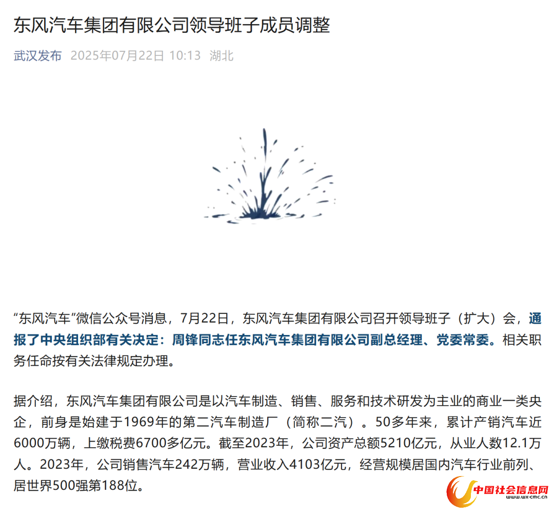 7月22日,据“武汉发布”,东风汽车集团有限公司召开领导班子(扩大)会,通报了中央组织部有关决定:周锋同志任东风汽车集团有限公司副总经理、党委常委。相关职务任命按有关法律规定办理。