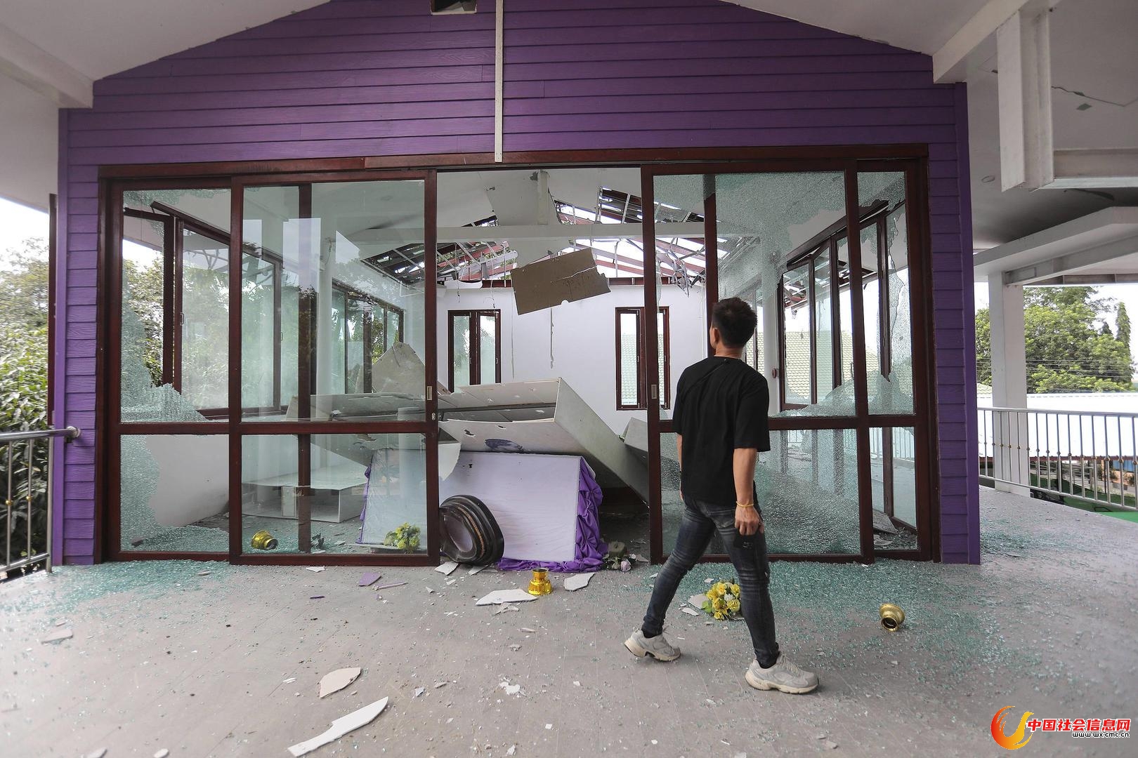 ▲当地时间7月24日,柬埔寨向泰国素林府发射炮弹后,泰国民众查看帕侬东拉克医院的受损情况。图据视觉中国