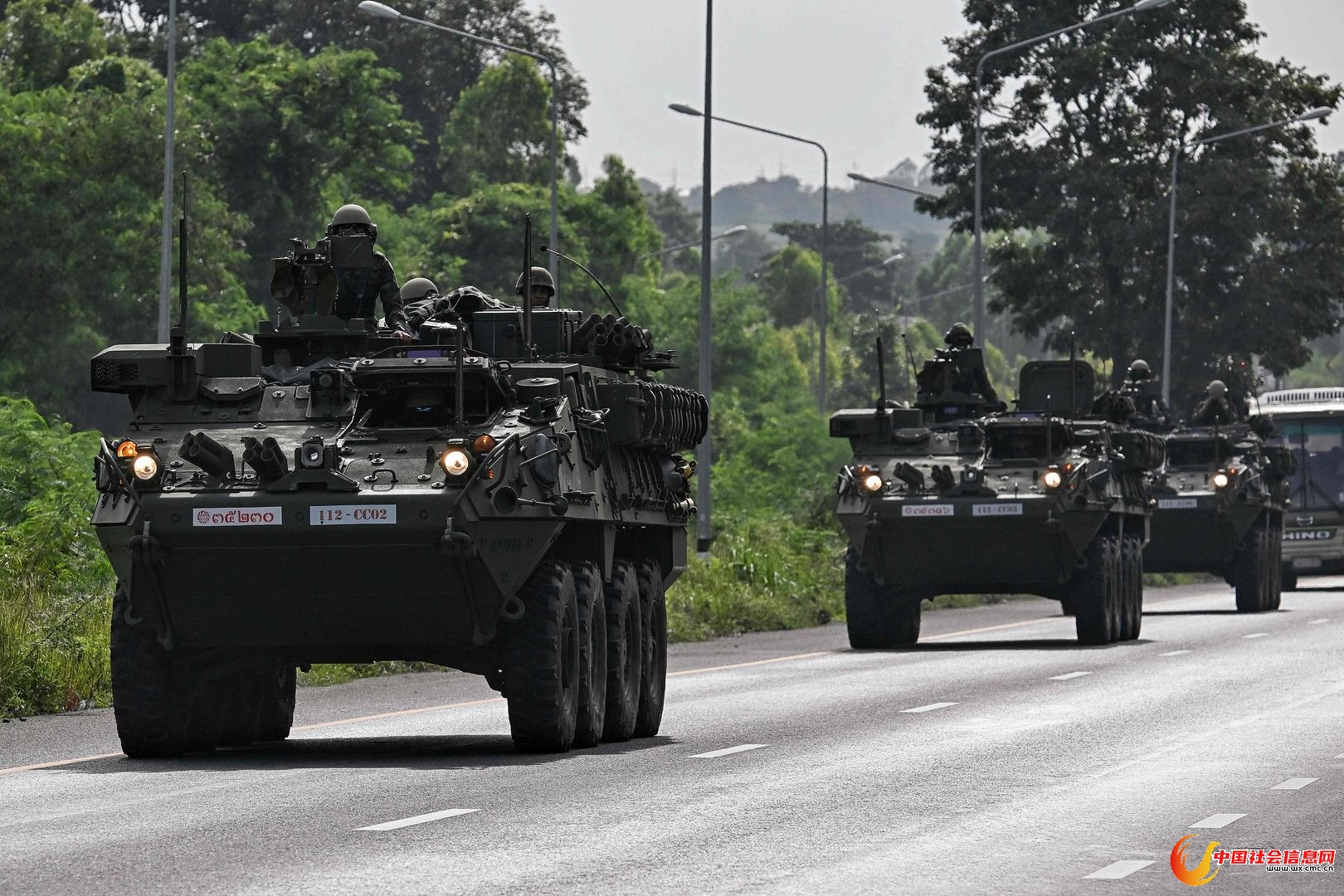 ▲当地时间7月24日,泰国差春骚府,泰国皇家陆军士兵乘坐装甲车行驶在公路上。图据视觉中国