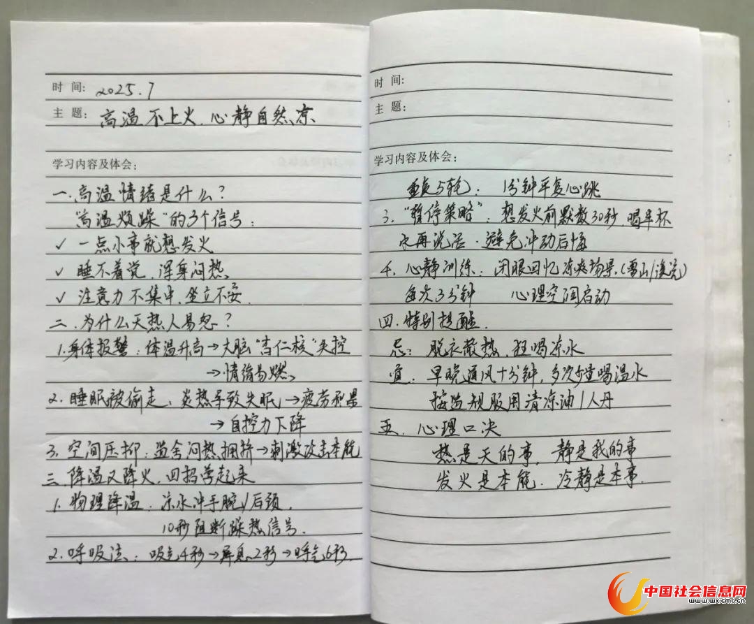 今夏特别是入伏以来,“蒸桑拿”和“洒水车”体感交替。这种天气,叠加封闭的监管环境,极易让罪犯情绪“中暑”——烦躁、易怒、难以安睡……怎么办?白茅岭监狱的民警们早有准备!他们精心调研策划,推出了一份夏日专属《高温不上火 心静自然凉》手抄报,精准滴灌到各个监区,化身这个夏天最实用的“心理调节工具”,在高墙内悄然构筑起一份特别的“情绪契约”。这份手抄报,为何如此走心?