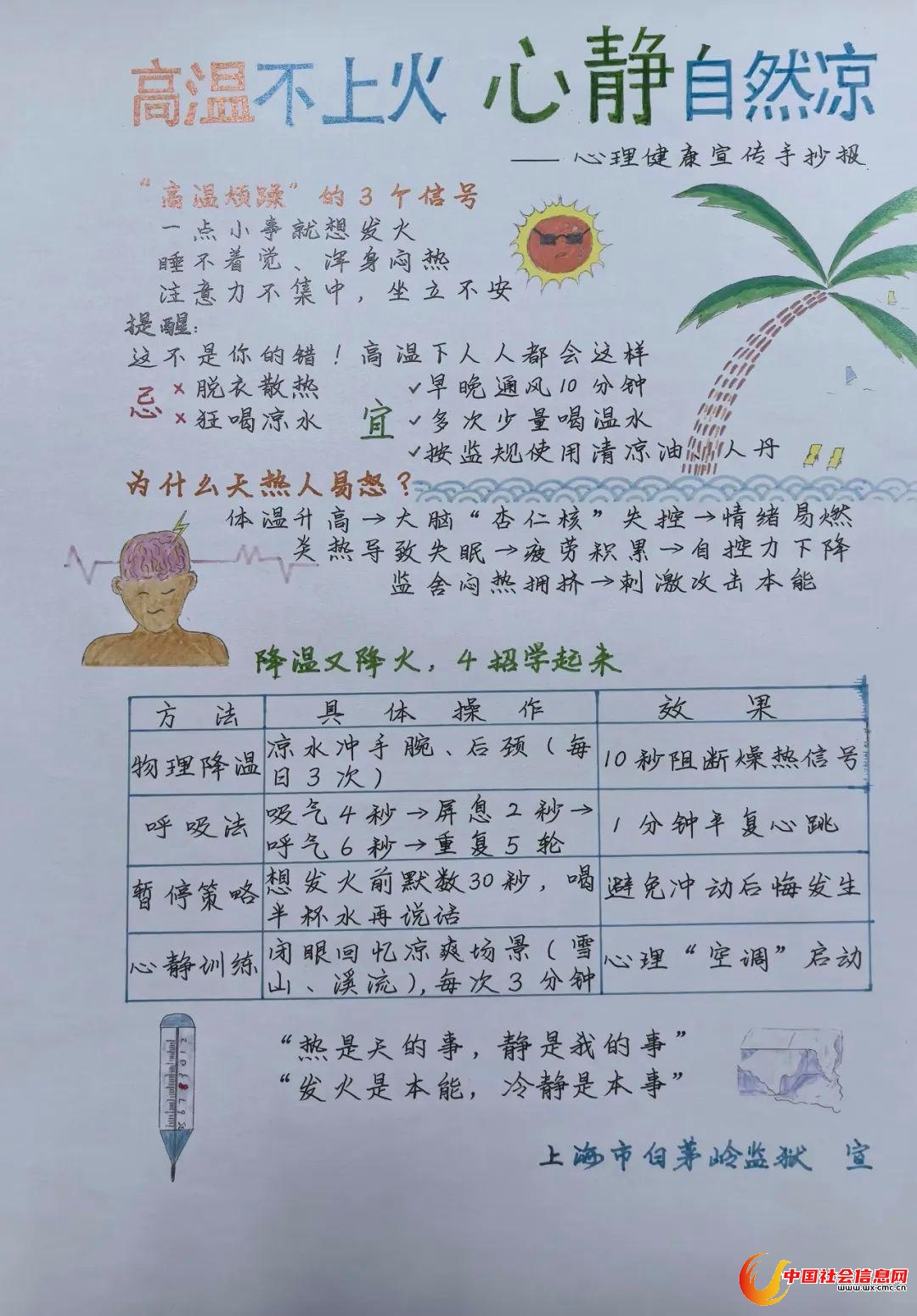 当“桑拿天”遇上高墙内的封闭环境,如何引导帮助罪犯稳住心神?白茅岭监狱民警有妙招——一份走心的《高温不上火 心静自然凉》手抄报,正成为罪犯夏日情绪的“清凉剂”!