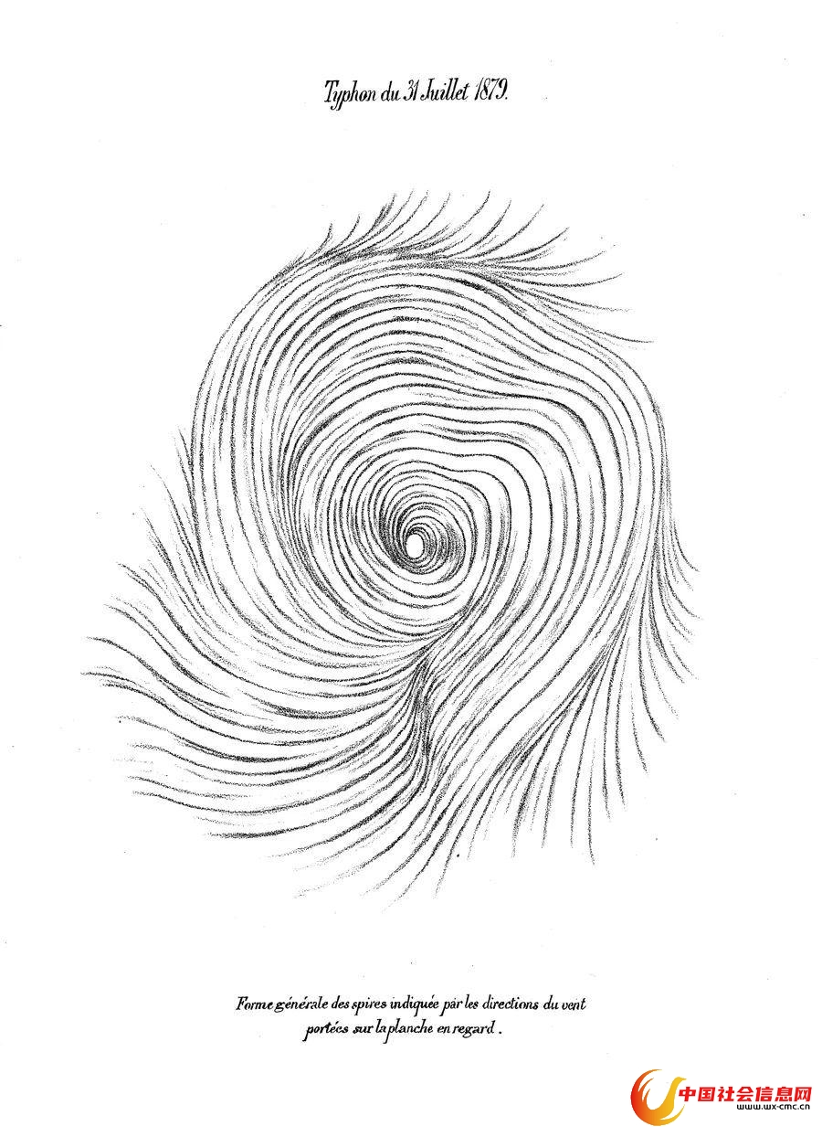 1879年,中国上海徐家汇观象台捕捉到台风过境时典型的气压骤降现象,台长能恩斯(marc dechvrens)等人据此手绘出人类历史上第一张台风结构示意图。