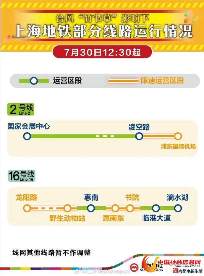 上海地铁shmetro今天中午发布运营调整信息:受台风“竹节草”影响,为确保轨道交通运营安全,今日(7月30日)12时30分起,2号线浦东1号2号航站楼站至凌空路站、16号线地面高架段列车限速运行,提醒乘客注意!