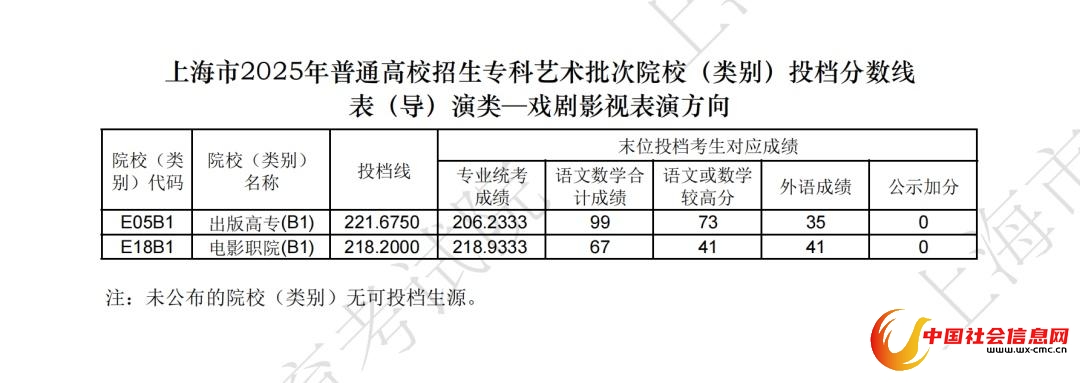 上海市2025年普通高校招生专科艺体类批次院校(类别)投档分数线公布,详见