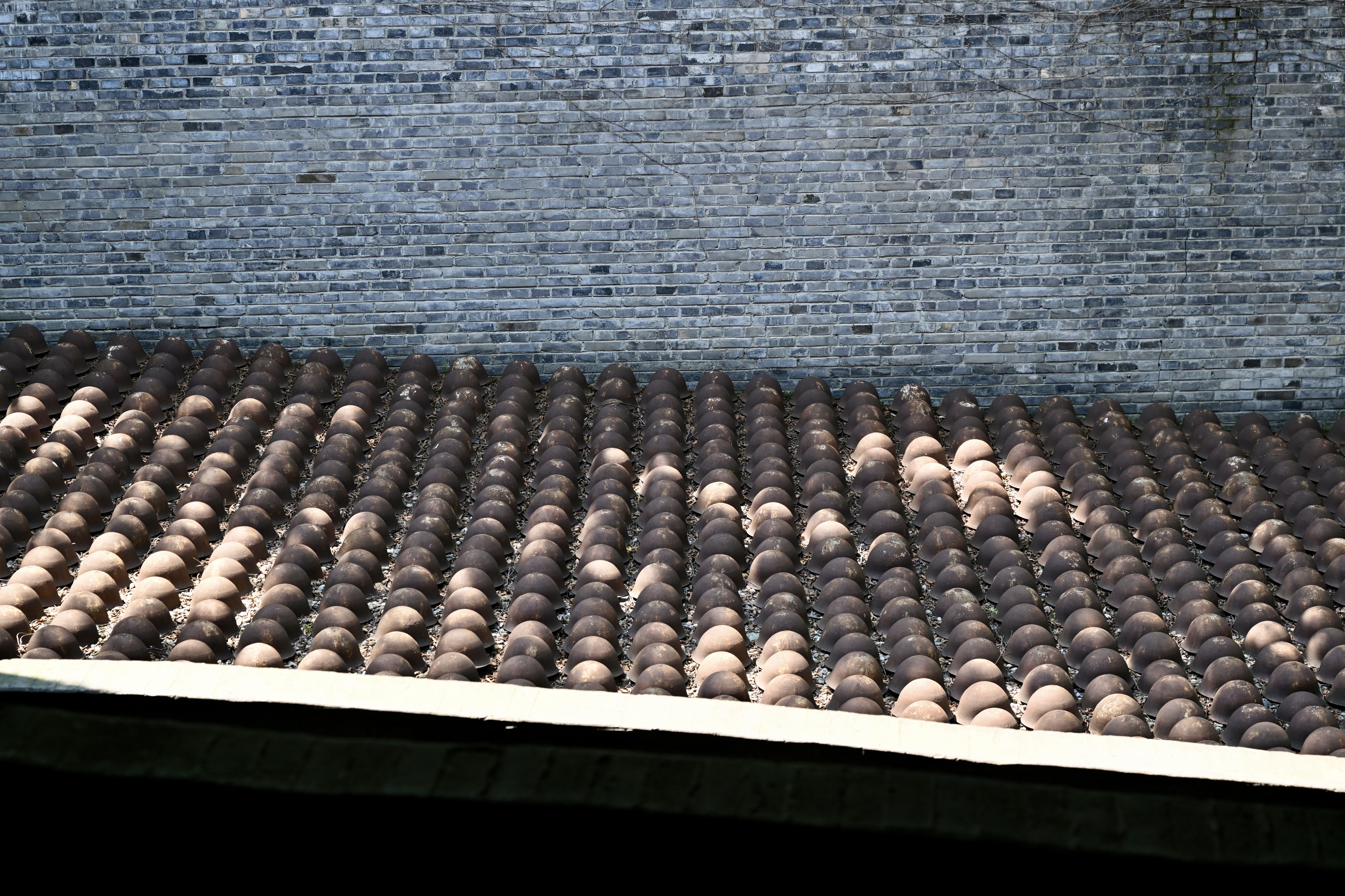 成都大邑,建川博物馆聚落日本侵华罪行馆前,1931顶日军钢盔帽檐低垂,排成了一个方阵。它们的实物被博物馆从国内多个战场收集而来。
