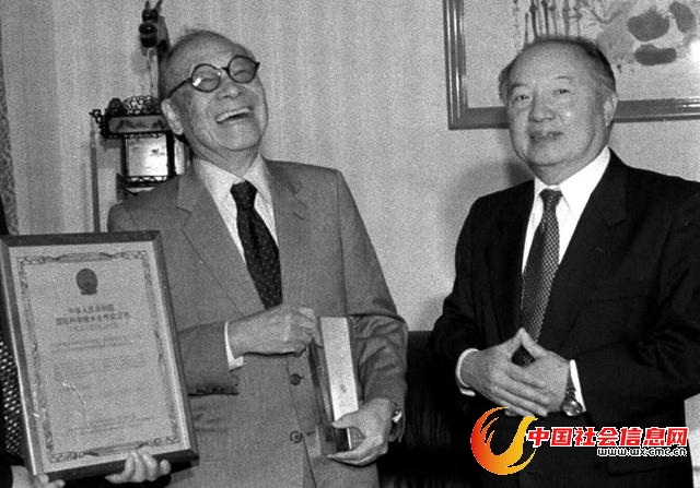 1997年9月3日,中国驻美大使李道豫(右)在华盛顿代表中国政府向世界著名华裔美国建筑师贝聿铭颁发1996年度中华人民共和国国际科技合作奖。 新华社图