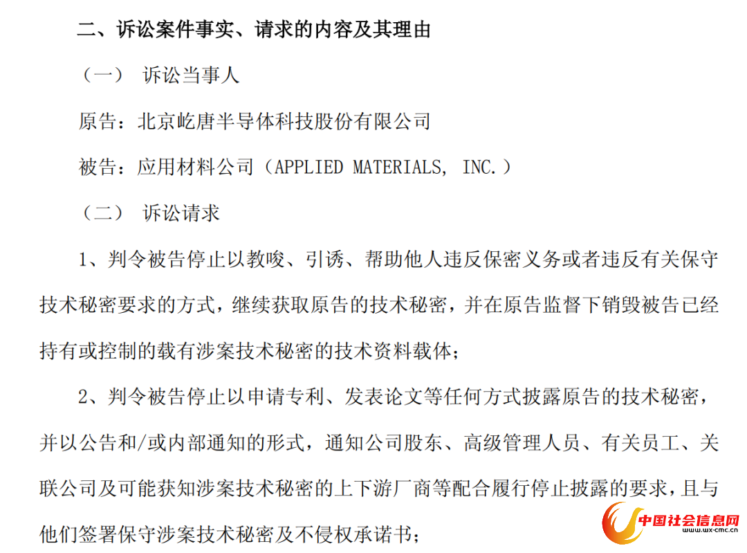 8月13日,北京屹唐半导体科技股份有限公司(以下简称“屹唐股份”)公告称,公司因认为应用材料公司(APPLIED MATERIALS, INC.)非法获取并使用了公司的等离子体源及晶圆表面处理相关的核心技术秘密,在中国境内以申请专利的方式披露了该技术秘密,且将该专利申请权据为己有,违反了《中华人民共和国反不正当竞争法》的规定,构成侵犯商业秘密的违法行为,向北京知识产权法院提起诉讼,诉讼金额为人民币9999万元。