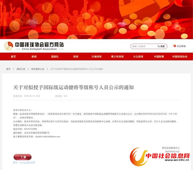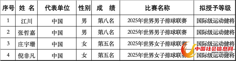 刚刚过去的周末,中国排协在官方网站上公示了拟授予国际级运动健将等级称号人员名单。来自上海的张哲嘉、中国男排队长江川以及两位中国女排队员庄宇珊和倪非凡,凭借在世界排球联赛中的成绩,获得被授予“国际级运动健将”的资格。这也是时隔13年后,中国男排再次有队员获得“国际级运动健将”的称号。