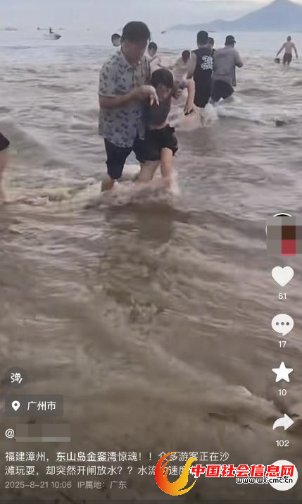 8月20日,有网友发视频称,福建省漳州市东山岛金銮湾,“众多游客正在沙滩玩耍,却突然开闸放水?水流的速度非常快,堪比山洪,几秒钟就把原本的沙滩全部淹没!眼看着冲走好几个人。”