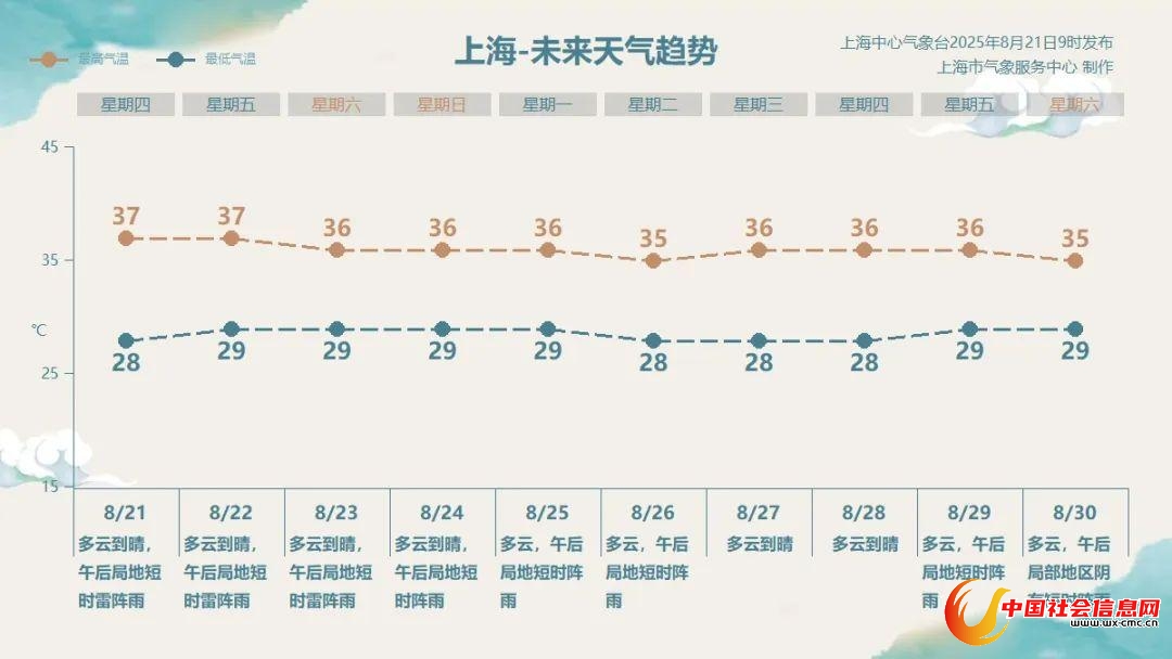 上海中心气象台2025年08月21日11时48分更新高温黄色预警信号为高温橙色预警信号:
