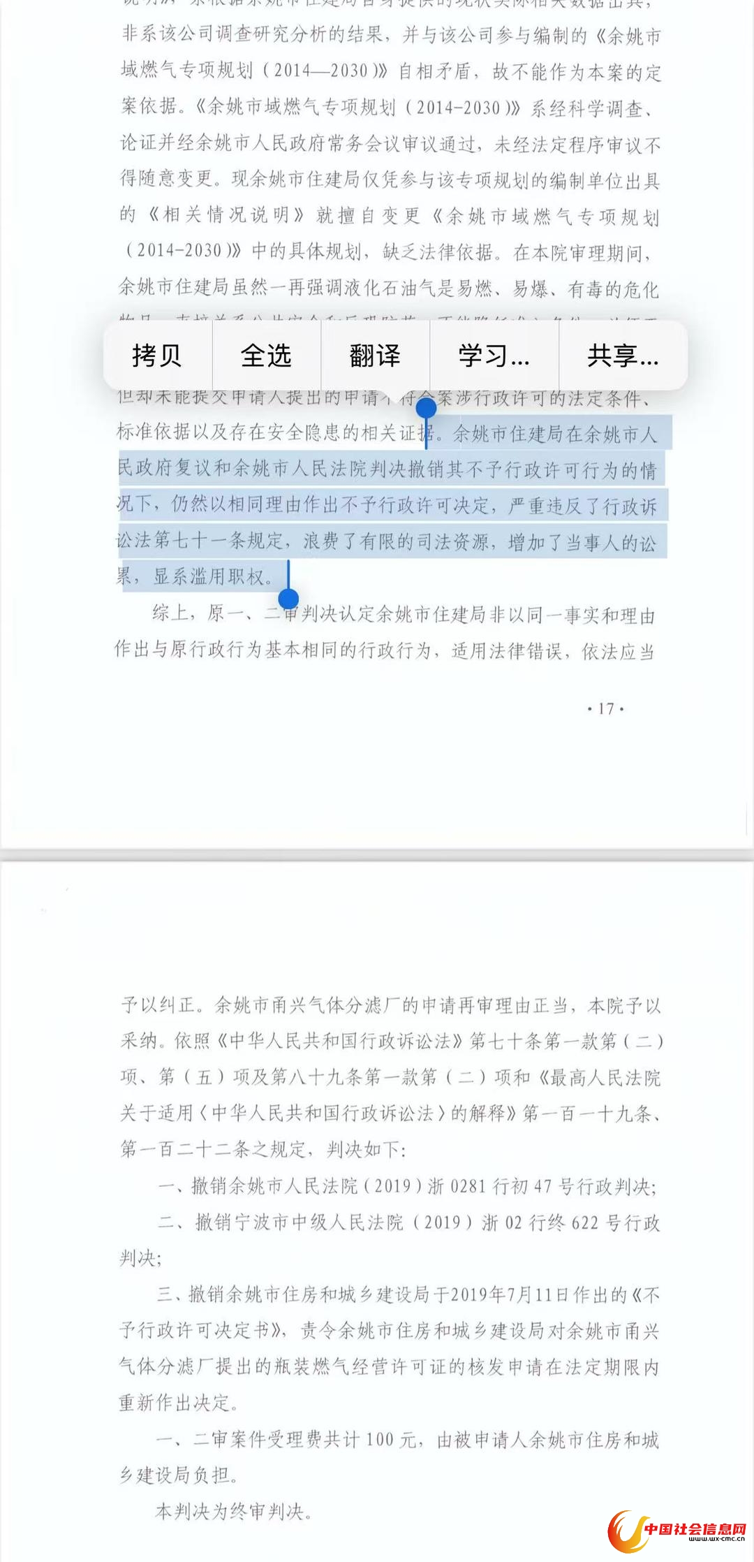 浙江高院的生效判决提到,余姚市住建局仅凭参与专项规划的编制单位出具情况说明,就擅自变更余姚市燃气专项规划的具体规划,缺乏法律依据。判决措辞还强调:余姚住建局在行政复议和法院判决撤销其不予许可行为后,仍以相同理由作出决定,严重违反《行政诉讼法》第七十一条规定,浪费了有限的司法资源,增加了当事人的诉累,显系滥用职权。