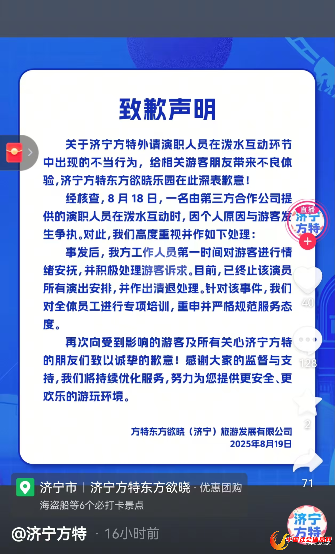 8月19日,方特东方欲晓(济宁)旅游发展有限公司发布道歉声明: